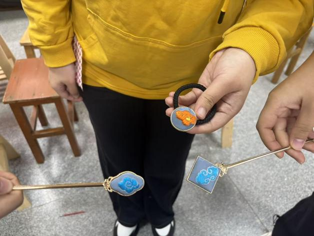 同学们满怀热情,认真聆听讲解、仔细观摩示范,在老师的手把手指导下,手持绣针、轻捻丝线,一步步尝试刺绣。大家全神贯注,小心翼翼地操控针线,在绣布上穿梭走线,慢慢掌握齐针的刺绣技巧。经过两个小时的动手实践,同学们纷纷完成了属于自己的汉绣作品,将基础针法运用到发簪等简易配饰制作中,一件件小巧精致的绣制配饰渐渐成形。
