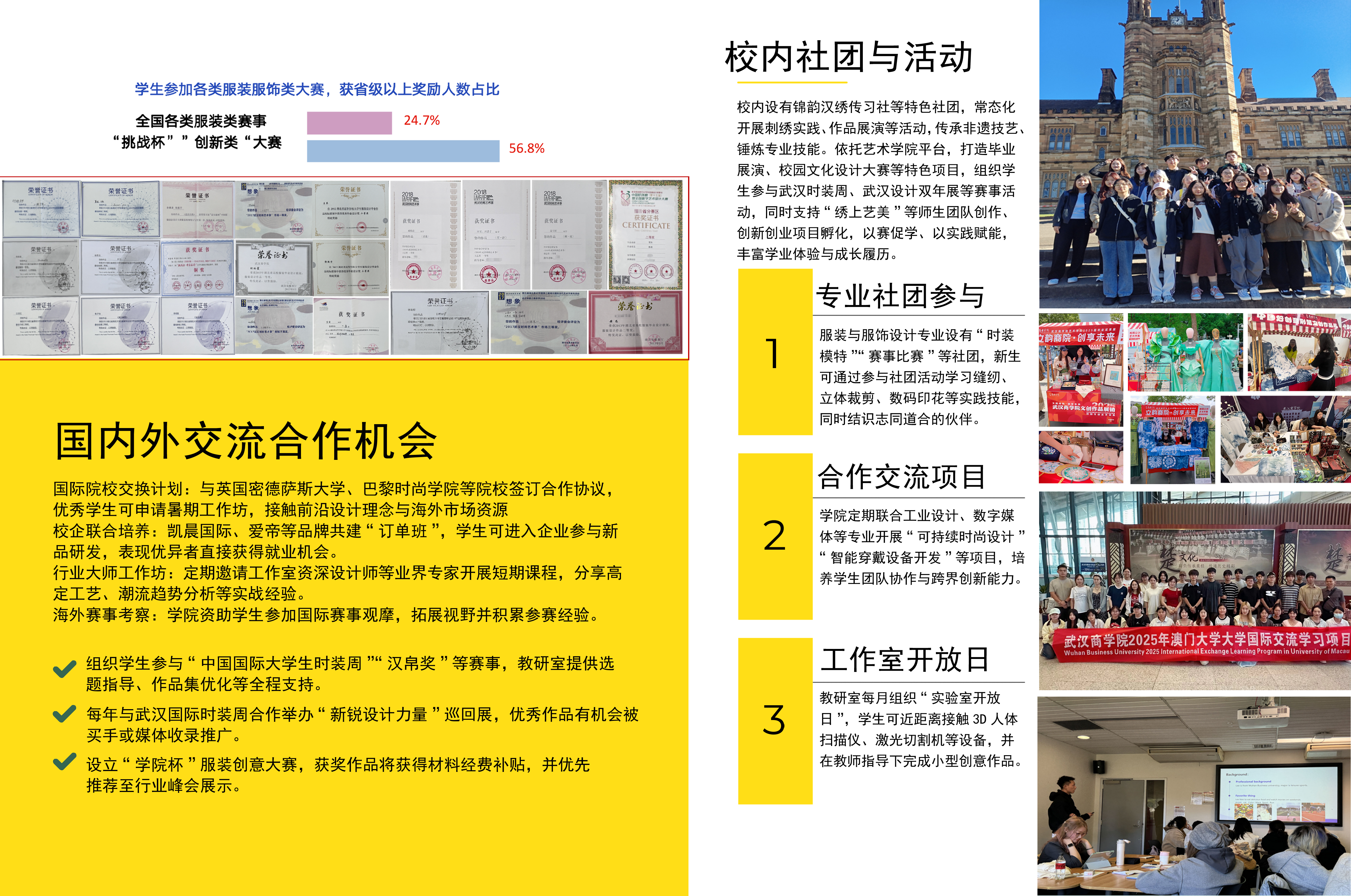 本专业致力于培养具备非遗传承素养与创新设计能力的高素质应用型人才。学生将系统掌握服装设计理论、传统手工艺技法与现代数字化设计与制版技术,能够在时尚产业中胜任产品开发、品牌运营、奢侈品营销及时尚评论等工作,具备较强的创新创业能力与职业发展潜力。